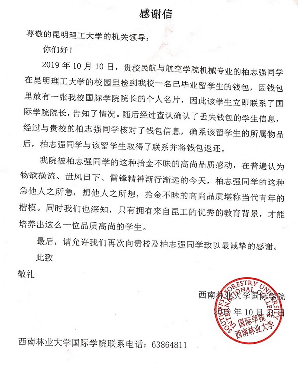 拾金不昧是中华民族的传统美德,是高尚道德情操的体现,也是党员践行初心使命的具体体现。近日,香蕉视频 收到来自西南林业大学国际学院的一封《感谢信》,信中大力称赞2016级学生柏志强拾金不昧的高尚品质。