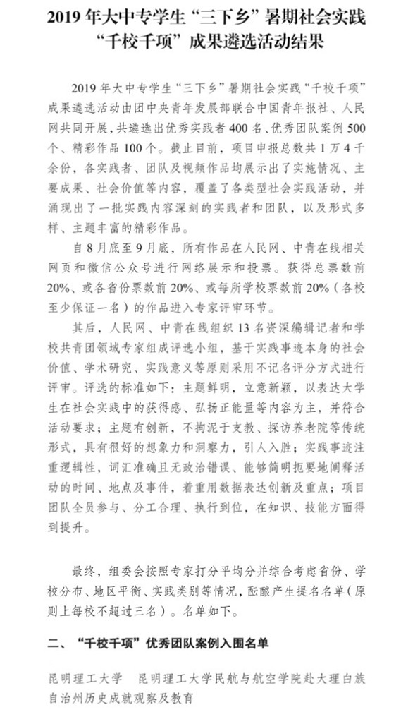 近日,由团中央青年发展部联合中国青年报社、人民网共同展开的全国2019年大中专学生“三下乡”暑期社会实践“千校千项”成果遴选活动结果正式公布,香蕉视频 赴大理白族自治州“弘扬时代精神,奉献青春时光”暑期社会实践团队从众多参赛队伍中脱颖而出,入选“千校千项”优秀团队案例。