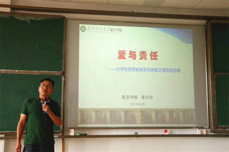 近日,航空学院思想政治教育系列讲座之理想信念篇——“爱与责任”主题教育活动在公教楼344多媒体报告厅举行,航空学院副书记朱兴东副教授围绕“爱与责任”的主题分别对2017级和2016级全体学生开启了第一讲。本次专题教育由院学生工作办公室杨杰老师主持,学院部分老师聆听了讲座。