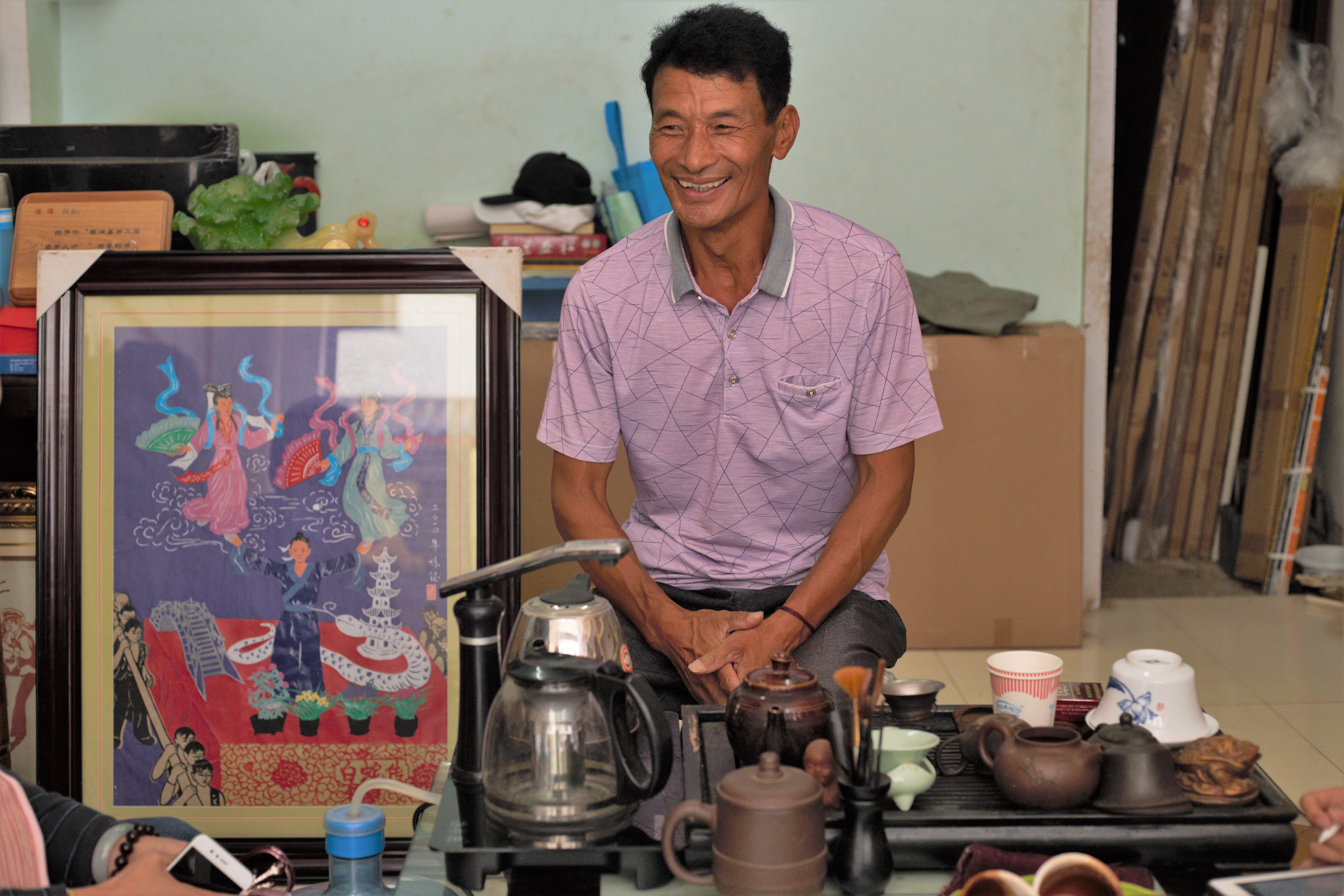 被誉为“中国民间扎染艺术之乡”的巍山县的扎染技术已经形成了工厂和企业,带动了当地的文化和经济,李石生先生就是传承扎染技术的一位彝族企业家。访谈中,李石生先生带领实践团队成员参观了扎染博物馆和扎染工厂,让队员们切身去认识扎染,讲述了自身30余年传承扎染的心路历程。彝乡南涧县也有剪纸艺术的流传,陈德先生用和蔼的微笑、最朴实的语言讲述着他对剪纸艺术的传承和坚持,作为云南省非物质文化遗产传承人,陈德先生将其一生融汇在剪纸中,一直在不遗余力地推广剪纸艺术,先后在云南省多所高校教授、推广剪纸技艺。“现在我做你们的老师,以后你们做我的老师更好”,这句朴实而简单的话实实在在地打动了每个人。