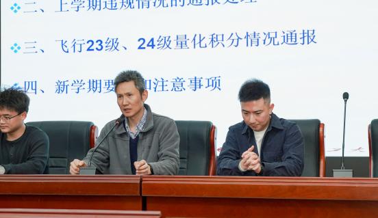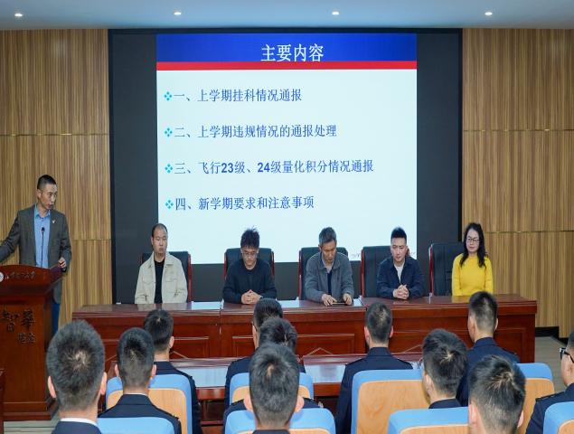 活动紧扣"思想引领、学业导航、行为规范"三大主题有序展开。系主任夏丰领系统总结上学期同学的学业情况,重点剖析课程挂科成因,强调"强基固本"的学习理念。飞行学生管理大队负责人郭建波结合准军事化管理要求,肯定学生在国防教育中展现的报国情怀,严明纪律规范要求。校督导专家王登霞从教学评估角度,针对飞行学员专业特点提出英语等重点学科的提升建议。