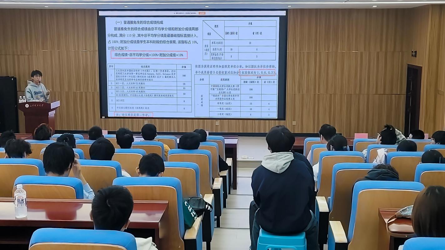 2022级优秀学生代表刘琪、王楠、姚佳怡、李佳蕊结合自身专业背景和成长经历,从保研准备、科研入门、竞赛拼搏、学习方法以及学业生活平衡等维度分享了宝贵经验。现场交流踊跃,新生们在互动中对大学四年的发展规划有了更清晰的认识。