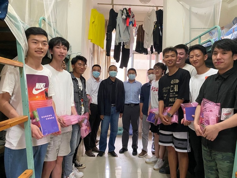 新学期开学,香蕉视频 党委书记赵耕、院长吴建德、副书记周业林、副院长黄国勇以及辅导员深入学生宿舍自习室看望慰问学生,并向同学们送去学院的问候和防疫健康包。