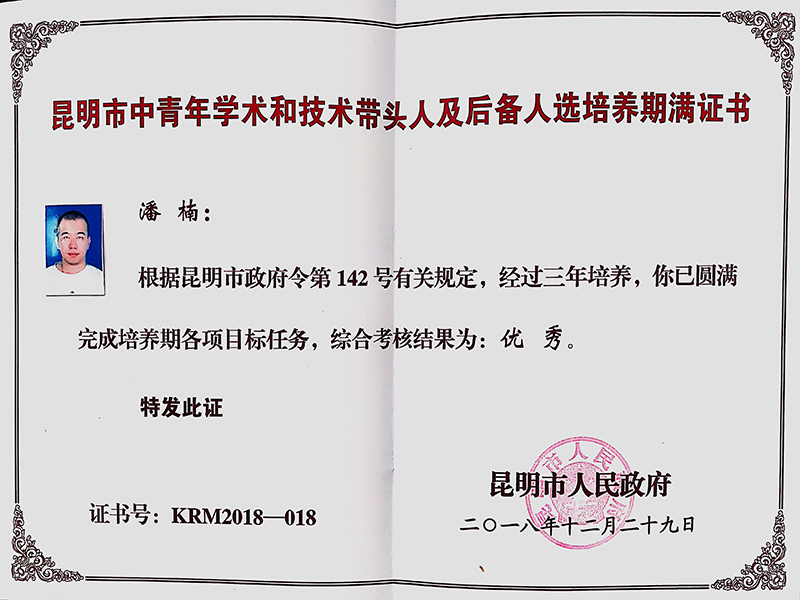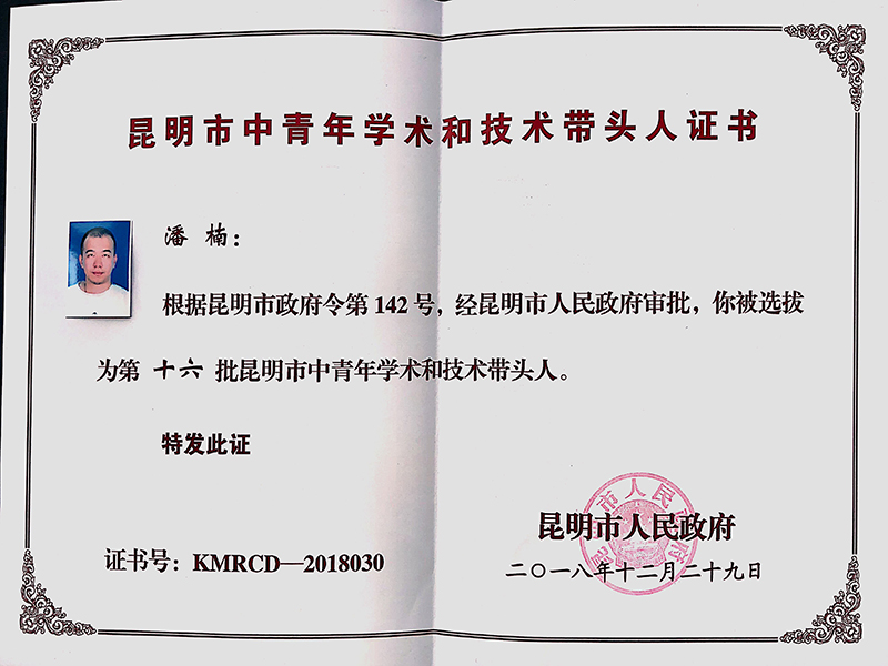 2019年8月14日下午,在昆明会堂8号会议室召开了2019年昆明市中青年学术和技术带头人及后备人选工作会议,会上对新入选的73名第十六批昆明市中青年学术和技术带头人及后备人选颁发了证书,我院潘楠副教授在“第十二批昆明市中青年学术和技术带头人后备人选”培养期间考核优秀,经遴选直升为入选“第十六批昆明市中青年学术和技术带头人”。