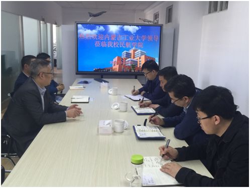 3月30日上午,内蒙古工业大学党政办公室主任兼航空学院院长孙志强,航空学院党总支书记王武、副院长韩建峰以及相关系部负责人到民航学院,就飞行技术专业申报、师资队伍建设、实训基地建设等进行考察交流。民航学院院长刘增力、副书记周业林、院长助理赵宣植参加座谈交流。