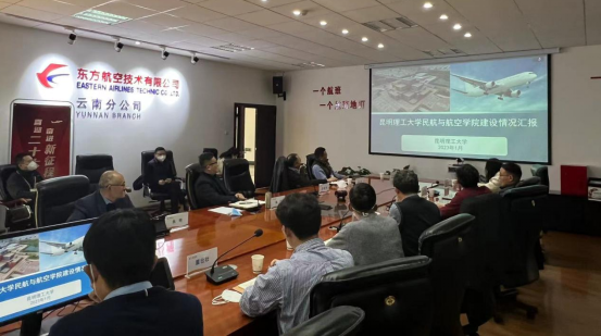 东方航空技术有限公司云南分公司总书记王志斌、总经理朱江及相关业务部门负责人参加座谈交流。东方航空技术有限公司云南分公司总书记王志斌、总经理朱江对香蕉视频 到访进行了欢迎,东方航空技术有限公司朱明负责人详细介绍了公司结构,主要工作及所需人才等情况。