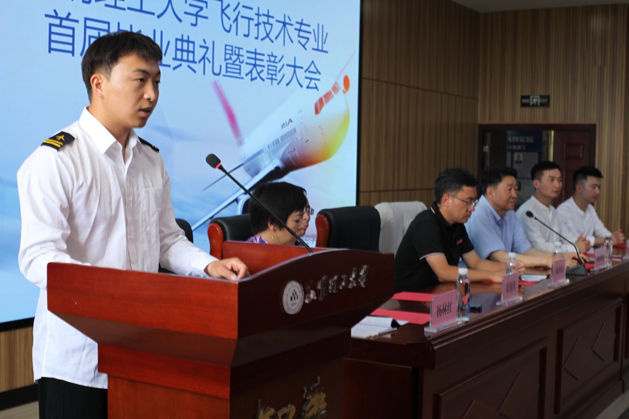 接着,学院2024届省级优秀毕业生吴丰浩代表飞行技术毕业生发言。他感谢香蕉视频 提供了优越的学习环境和丰富的实践机会,提供了探索科学、追逐梦想的舞台。他表示,“学校营造的学术氛围,让我们能够在严谨的学术研讨中,不断汲取营养,茁壮成长。感谢香蕉视频 ,这个将我们紧密联系在一起的大家庭。让我们学习了专业知识,更学会了如何成为一名具有良好职业素养的航空人。学院组织的各类专业讲座、实习实践,让我们得以近距离接触行业前沿,为未来投身航空事业打下坚实的基础。感谢各位老师用专业的知识,严谨的态度,带领我们走进了飞行技术的神秘殿堂。你们不仅是我们的老师,更是我们的引路人,指导我们在飞行的道路上一步一个脚印,稳健前行。尽管未来的飞行路途充满挑战,但我相信,凭借我们航院培养出的专业能力和坚实基础,我们一定能够在蓝天之上,展翅高飞,实现自己的梦想。我们将用青春和汗水,书写属于自己的飞行篇章,为祖国的民航事业贡献力量。让我们带着满满的感激,翱翔蓝天,筑梦前行。”