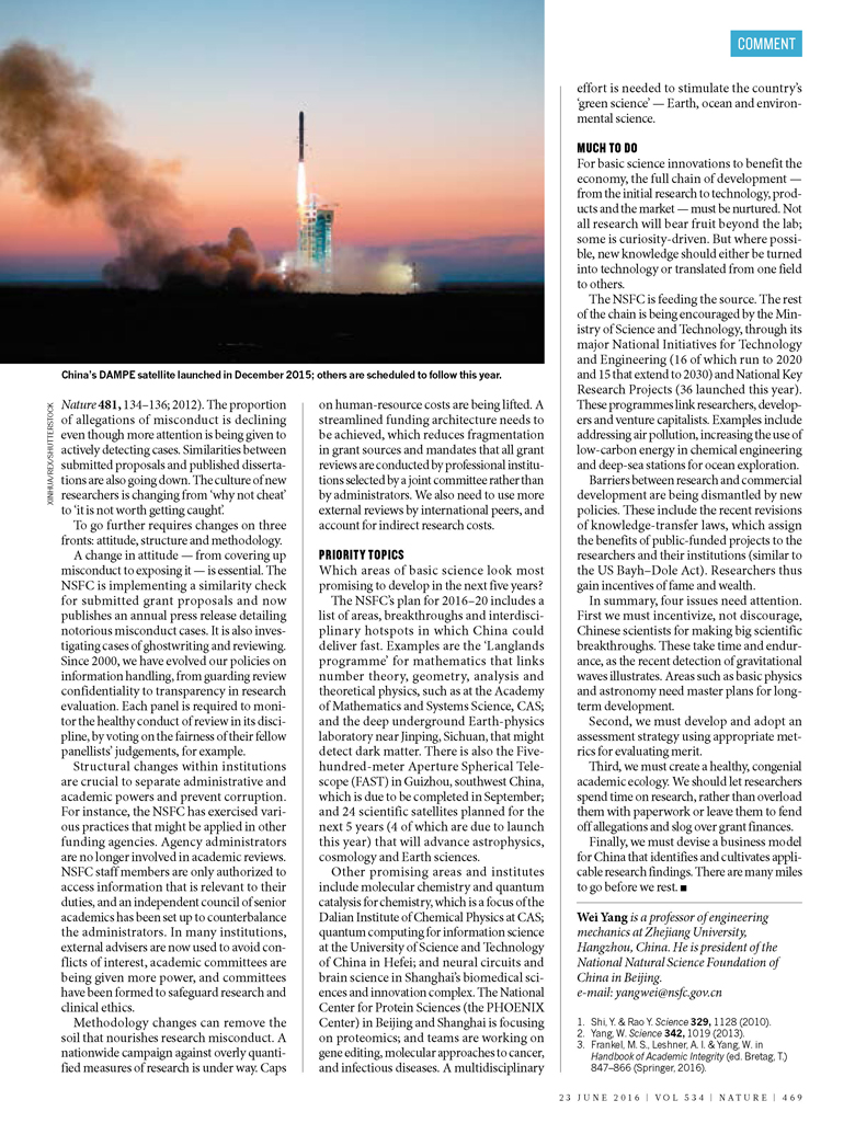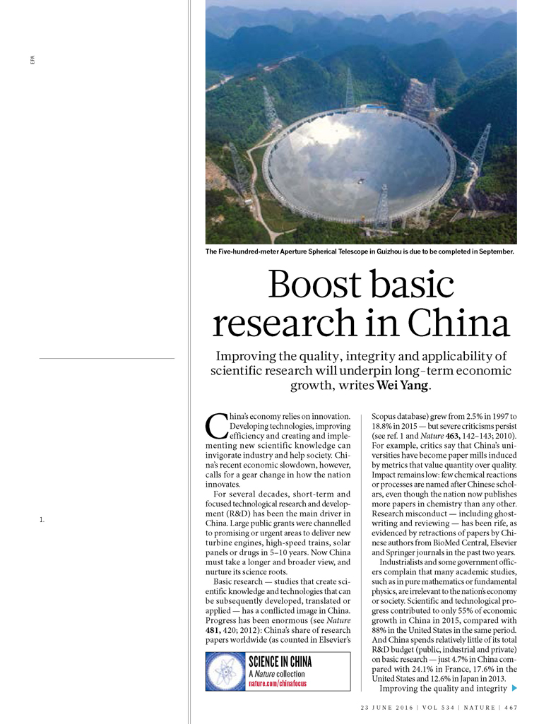 2016年6月23日,杨卫主任在Nature(《自然》)发表评论文章“Boost basic research in China(推进基础研究在中国发展)”(Nature534, 467-469(2016))。