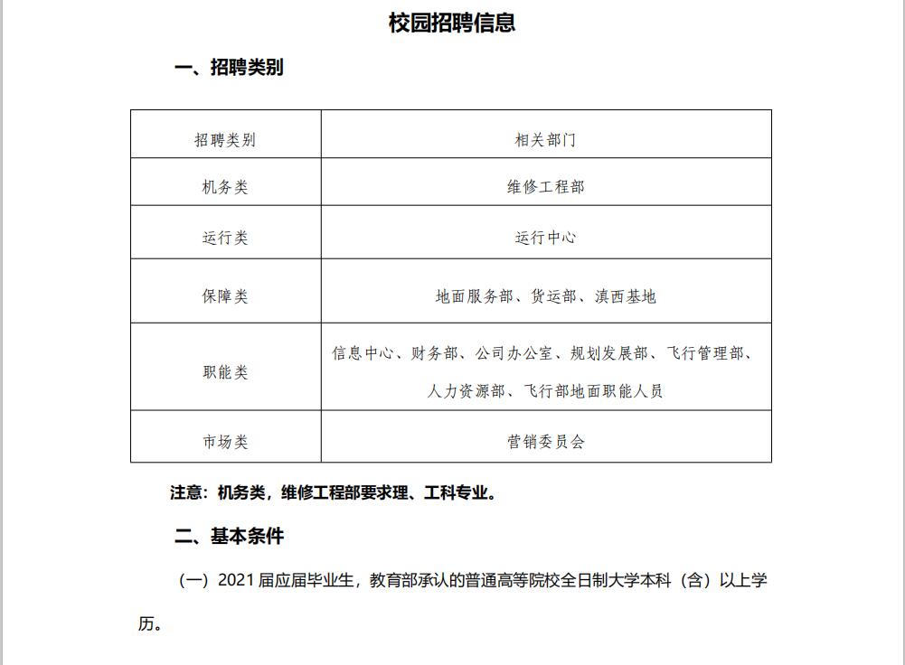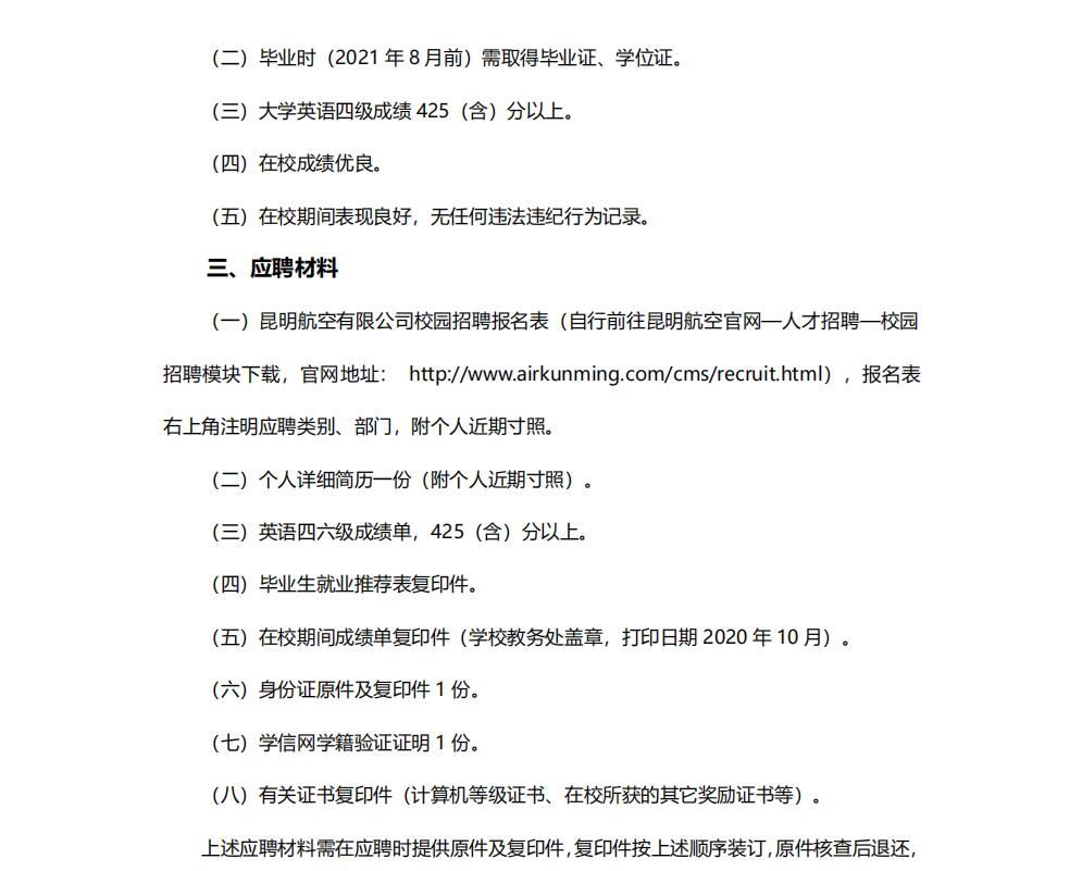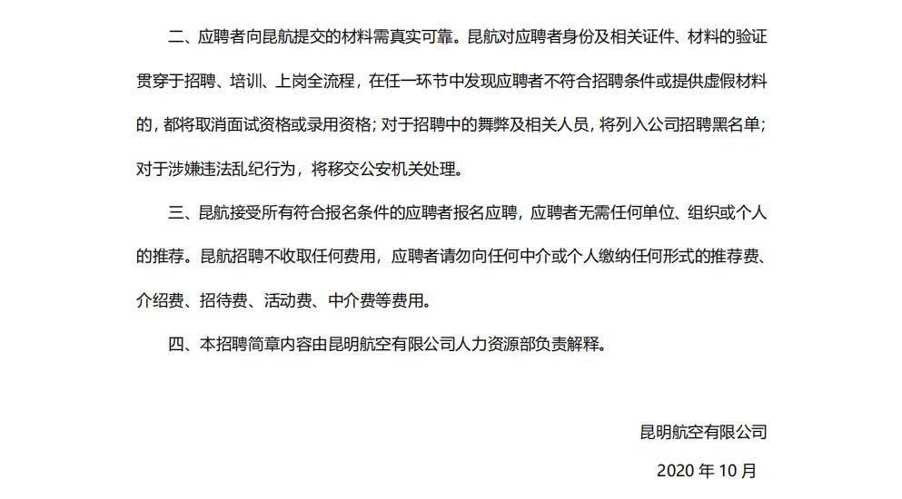 昆明航空有限公司(以下简称“昆航”)是经中国民用航空局批准成立的航空运输企业,于 2009 年 2 月 15 日正式开航。公司以昆明长水国际机场为运营基地,主要经营航空客、货运输业务。目前昆航拥有员工 2500 余人,共运营波音 737 飞机 30 架,经营国内国际航线 69 条,通航城市 47 个,共计承运旅客 3422.26 万人次,累计航班起降次数 29.4 万架次。为适应公司发展需要,昆航现启动 2021 届应届生校园招聘工作,真诚欢迎有志于中国民航事业的优秀应届毕业生加入到昆航大家庭中来。